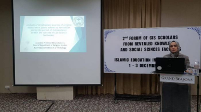 Azərbaycan İlahiyyat İnstitutunun Dinşünaslıq kafedrasının müdiri dos. Elnurə Əzizova Beynəlxalq İslam Düşüncəsi İnstitutu və Malayziya Beynəlxalq İslam Universitetinin birgə təşkilatçılığı ilə Kuala Lumpur şəhərində keçirilən “MDB ölkələrində İslam təhsili” adlı beynəlxalq konfransda iştirak edib. On ölkədən 30-a yaxın məruzəçi MDB ölkələrinin orta və ali məktəblərində din və İslam təhsilinə dair səpkili mövzularla simpoziumda çıxış edib. Dos. Elnurə Əzizova simpoziumda “Müstəqillik dövrünün Azərbaycan məktəblərində din təhsilinin inkişaf prosesi Həyat bilgisi dərslikləri çərçivəsində” (Analysis of development process of religion education in public schools of Azerbaijan during the period of independence (within the context of Life Science textbooks) məruzəsi ilə çıxış edib. Məruzədə dünyəvi dövlət olan Azərbaycanın orta məktəblərində müstəqil din dərsinin olmadığı, 1-9-cu siniflərdə Həyat bilgisi dərsliyində dinlə əlaqəli məlumatların tədris edildiyi, bu fənn ilə şagirdlərə müxtəlif dünya dinləri haqqında ümumi dünyagörüşü sayılan əsas biliklərin öyrədildiyi, milli və bəşəri dəyərlərə əsaslanan tərbiyənin daha sistemli və nəticəyönümlü olaraq mənimsədildiyi bildirilib. Məruzədə kvantitativ məzmun analizi və kvalitativ mövzu analizi metodlarından istifadə olunaraq, “Həyat bilgisi” dərsliklərində dinə baxışı əks etdirən üslub, məzmun və vizuallar dəyərləndirilib. “Həyat bilgisi” dərsliklərində, ümumilikdə, dinin necə təmsil olunduğu, dinin əsasən hansı anlayışlarla əlaqələndirilərək təqdim olunduğu, dini biliklərin verilməsi zamanı hansı üslubdan istifadə olunduğu, Azərbaycanın özünəməxsus dini demoqrafiyasının hansı səviyyədə diqqətə alındığı, dini tolerantlığın Azərbaycan modelinin necə əks olunduğu məsələlərinə aydınlıq gətirilib.