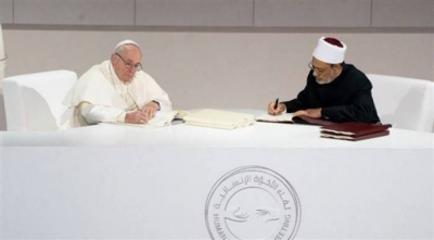 Əbu-Dabidə Əl-Əzhar İslam Universitetinin baş imamı şeyx Əhməd Al Tayib və Roma Papası Fransisk “İnsanların qardaşlığı” mövzusunda keçirilən beynəlxalq konfransın yekunlarına dair birgə sənəd imzalayıblar.