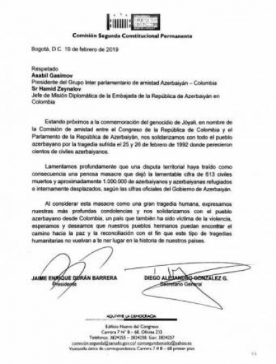 Xocalı soyqırımı ilə əlaqədar Kolumbiya parlamentinin beynəlxalq əlaqələr komitəsinin sədri Xaime Duran və həmin komitənin baş katibi Dieqo Alexandro Qonzalez tərəfindən ölkəmizin Boqotadakı səfirliyinə başsağlığı məktubu ünvanlanıb.