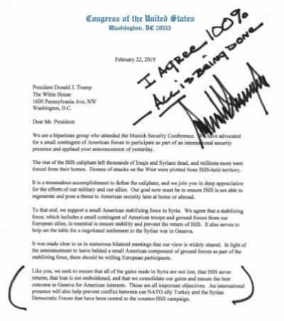 2018-ci ilin dekabrında Tramp Suriyadan ABŞ qoşunlarının çıxarılmasının vacibliyini bildirəndən sonra hər iki partiyanı təmsil edən bir qrup senator Ağ Evə - Trampa məktub ünvanlayıb. Məktubda hərbi kontingentin heç olmazsa bir hissəsinin Suriyada saxlanılması təkid edilir.