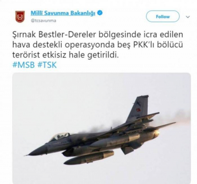 Türkiyənin Şırnak vilayətinin Bestler-Dereler bölgəsində bu ölkənin Hərbi Hava Qüvvələrinin qırıcılarının dəstəyi ilə uğurlu antiterror əməliyyatı keçirilib.