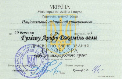 Ukrayna Təhsil və Elm Nazirliyinin Attestasiya Kollegiyasının qərarı ilə azərbaycanlı alim, Ukraynadakı diasporumuzun ən fəal üzvlərindən biri, hüquq elmləri doktoru Arif Quliyevə beynəlxalq hüquq kafedrasının professoru elmi adı verilib.