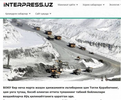 Özbəkistanın interpress.uz portalında Azərbaycanın Ermənistan tərəfindən işğal olunmuş ərazilərində təbii ehtiyatların talanması ilə bağlı məqalə yerləşdirilib.