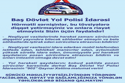 Bununla yanaşı posterdə, yol hərəkəti qaydalarını kobud şəkildə pozan sürücülər barəsində dərhal Baş Dövlət Yol Polisi İdarəsinin “902” Qaynar Xəttinə məlumat vermələri də sərnişinlərdən xahiş olunur.