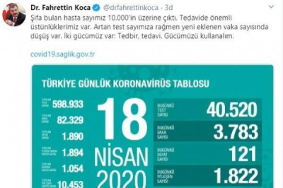 Epidemiya ilə bağlı vəziyyətə dair son rəqəmlər barədə Türkiyə Səhiyyə Nazirliyinin rəsmi saytında məlumat verilib. Aprelin 18-də ölkə üzrə 40 min 520 nəfər üzərində test aparılıb. Onlardan 3 min 783 nəfərdə infeksiya aşkarlanıb. Bu gün yoxlanılan təxminən hər 11 nəfərdən biri xəstə çıxıb. Müqayisə göstərir ki, yoluxmalarda əhəmiyyətli dərəcədə azalma var.
