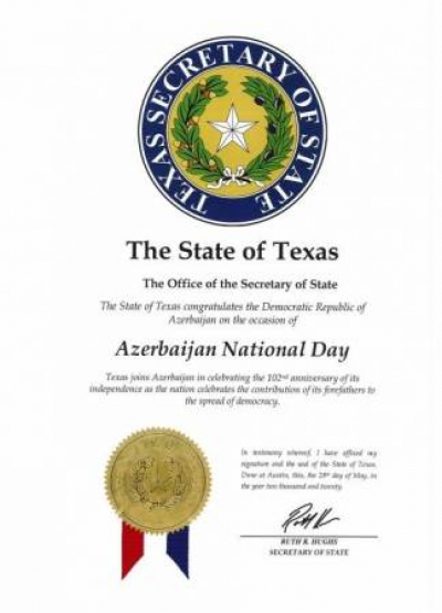 ABŞ-ın energetika mərkəzi sayılan və çoxsaylı soydaşlarımızın yaşadığı Texas ştatının dövlət katibi Rut Hyuz tərəfindən Azərbaycan Demokratik Respublikasının yaranmasının 102-ci ildönümü ilə əlaqədar rəsmi təbrik bəyannaməsi hazırlanıb.