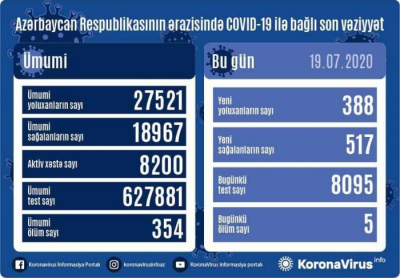 Nazirlər Kabineti yanında Operativ Qərargahdan verilən məlumata görə, Azərbaycanda 388 yeni koronavirus infeksiyasına yoluxma faktı qeydə alınıb, 517 nəfər müalicə olunaraq sağalıb və evə buraxılıb.