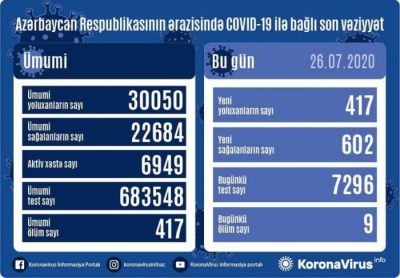 Azərbaycanda koronavirus (COVID-19) infeksiyasına 417 yeni yoluxma faktı qeydə alınıb, 602 nəfər müalicə olunaraq sağalıb və evə buraxılıb.