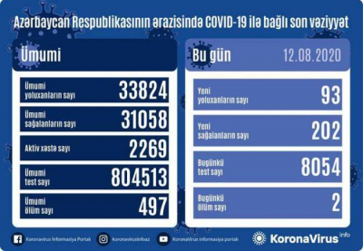 Azərbaycan Respublikasında koronavirus (COVID-19) infeksiyasına 93 yeni yoluxma faktı qeydə alınıb, 202 nəfər müalicə olunaraq sağalıb və evə buraxılıb.