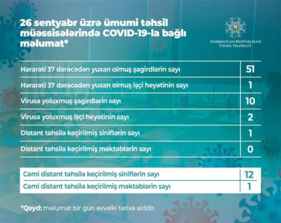 Nazirlikdən bildirilib ki, sentyabrın 26-da 51 şagird və 1 işçinin hərarəti 37 dərəcədən yuxarı olub.