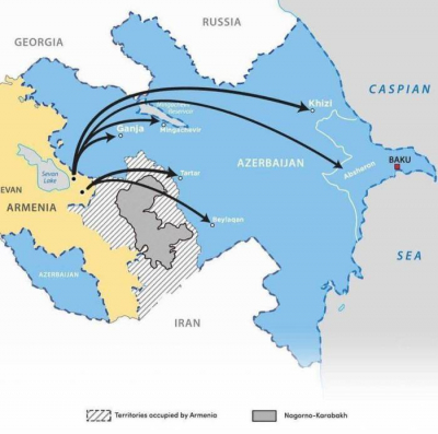 Beynəlxalq Münasibətlərin Təhlili Mərkəzinin İdarə Heyətinin sədri Fərid Şəfiyev öz “Twitter” hesabından Ermənistanın Azərbaycanın müxtəlif ərazilərinə raket hücumlarını göstərən xəritə paylaşıb.