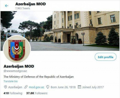 Ermənistan tərəfindən Azərbaycan Respublikası Müdafiə Nazirliyi adına saxta "Twitter" hesabı açılıb.