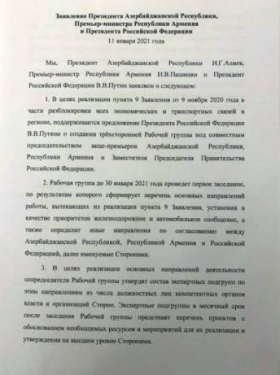 Azərbaycan Respublikasının Prezidenti İlham Əliyev, Ermənistan Respublikasının baş naziri Nikol Paşinyan və Rusiya Federasiyasının Prezidenti Vladimir Putin bəyanat imzalayıblar.