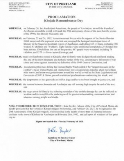 ABŞ-ın Men ştatının Portlənd şəhərinin meri Ketlin M.Snayder 2021-ci il fevralın 26-nın Xocalı qətliamı qurbanlarının anım günü kimi qeyd olunmasına dair bəyanat imzalayıb.
