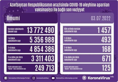 Nazirlər Kabineti yanında Operativ Qərargahdan verilən məlumata görə, bir gündə birinci mərhələ üzrə vaksinasiya olunanların sayı 493, ikinci mərhələ üzrə vaksinasiya olunanların sayı 168, üç və daha çox doza üzrə vaksinasiya olunanların sayı 671, pozitiv nəticədən sonra buster doza üzrə vaksinasiya olunanların sayı 125 nəfərdir.