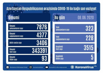 Azərbaycan Respublikasında koronavirus infeksiyasına 323 yeni yoluxma faktı qeydə alınıb, 228 nəfər müalicə olunaraq sağalıb və evə buraxılıb.