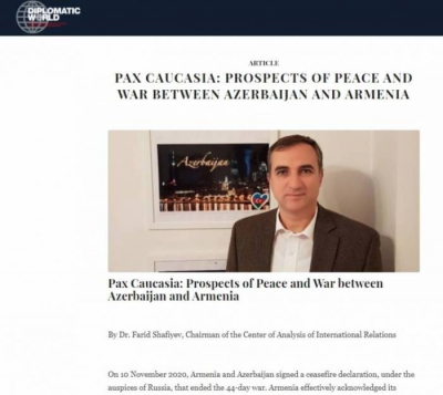 Beynəlxalq Münasibətlərin Təhlili Mərkəzinin İdarə Heyətinin sədri Fərid Şəfiyevin “Diplomatic World” dərgisində “Ermənistanla Azərbaycan arasında sülh və müharibə perspektivləri” başlıqlı məqaləsi dərc olunub.