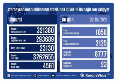 Azərbaycan Respublikasında koronavirus (COVID-19) infeksiyasına 1 058 yeni yoluxma faktı qeydə alınıb, 2 125 nəfər müalicə olunaraq sağalıb.