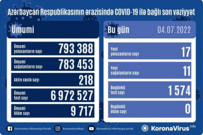 Azərbaycanda indiyədək ümumilikdə 793 388 nəfər koronavirus infeksiyasına yoluxub. Onlardan 783 453 nəfər müalicə olunaraq sağalıb, 9 717 nəfər vəfat edib, aktiv xəstə sayı 218 nəfərdir.
